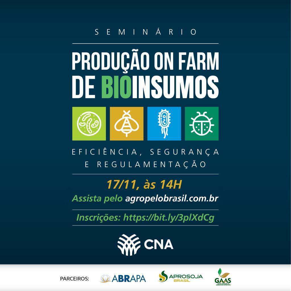 Brasília (16/11/2020) – A Confederação da Agricultura e Pecuária do Brasil (CNA), a Associação dos Produtores de Soja do Brasil (Aprosoja Brasil), a Associação Brasileira dos Produtores de Algodão (Abrapa) e o Grupo Associado de Agricultura Sustentável (GAAS) realizam, amanhã (17), às 14h, um seminário sobre a produção on farm (na fazenda) de bioinsumos.
