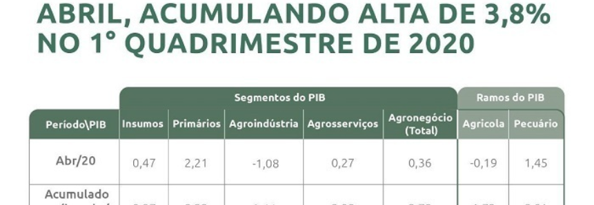 Com esse resultado, a atividade agropecuária, segundo a CNA, ganhou mais relevância no PIB do Brasil, aumentando sua participação de 6,7% em 2019 para 7,1%. Em relação ao agronegócio, que envolve toda a cadeia produtiva, a previsão é de que a participação do setor no PIB total do Brasil suba de 21,4% em 2019 para 24,5% em 2020.