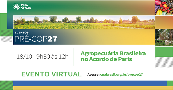 O seminário online irá tratar, das 9h às 12h, de temas como “A agricultura no âmbito do Acordo de Paris (trabalho conjunto de Koronivia)” e o “Cenário internacional dos compromissos ambientais e a segurança alimentar”. O encerramento será feito pelo presidente da Comissão Nacional de Meio Ambiente da CNA, Muni Lourenço.
