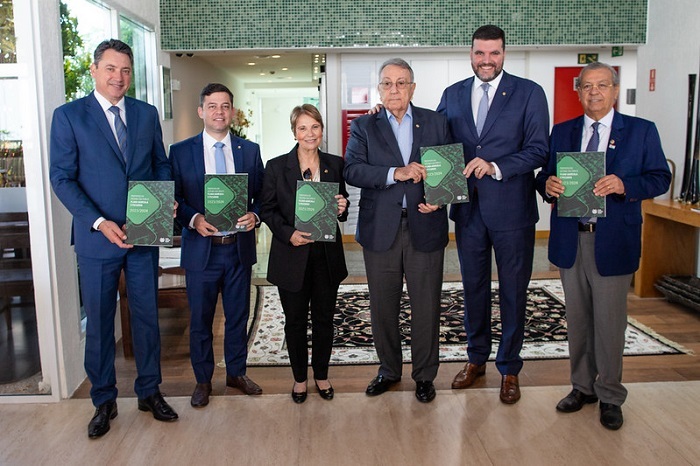 Brasília (10/05/2023) - O presidente da CNA, João Martins, entregou, na quarta (10), o documento com as propostas da entidade para o Plano Agrícola e Pecuário (PAP) 2023/2024 ao presidente da Frente Parlamentar da Agropecuária (FPA), Pedro Lupion (PP/PR), ao presidente da Comissão de Agricultura da Câmara, Tião Medeiros (PP/PR), ao deputado Sérgio Souza (MDB/PR), aos senadores Jayme Campos (União Brasil/MT) e Tereza Cristina (PP/MS), e ao chefe de gabinete do senador Zequinha Marinho (PL/PA), Alexandre Bodoni.