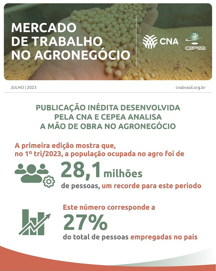 Brasília (01/08/2023) – A Confederação da Agricultura e Pecuária do Brasil (CNA) lançou o boletim “Mercado de Trabalho do Agronegócio Brasileiro”, uma publicação inédita feita em parceria com o Centro de Estudos Avançados em Economia Aplicada (Cepea) para analisar a população ocupada no setor a cada trimestre e a evolução do “estoque de empregos”, comparando com a série histórica já feita pelo Cepea desde 2012.