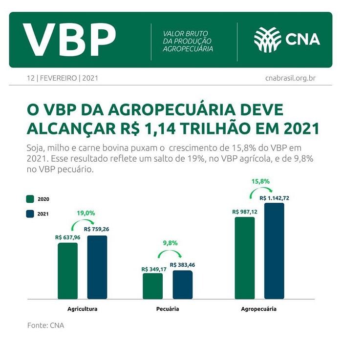 Brasília (18/02/2021) – O Valor Bruto da Produção (VBP) agropecuária deve atingir receita recorde R$ 1,142 trilhão em 2021, um crescimento de 15,8% em relação ao ano passado, segundo estimativa da Confederação da Agricultura e Pecuária do Brasil (CNA), com base nos dados de janeiro.