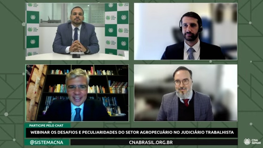 O coordenador trabalhista da CNA, Rodrigo Hugueney, e o assessor jurídico Welber Santos conduziram a discussão, que contou com a participação do professor e juiz do Trabalho, Otávio Calvet, e o diretor-presidente do Instituto DIA e advogado trabalhista, Gáudio Ribeiro de Paula.