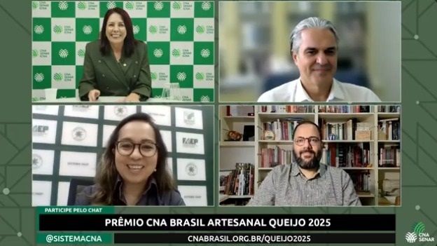 Brasília (24/04/2025) - A Confederação da Agricultura e Pecuária do Brasil (CNA) promoveu, na quarta (23), uma live sobre o Prêmio CNA Brasil Artesanal 2025 Queijos. Participaram do encontro Fernanda Regina Silva, assessora técnica da CNA e organizadora do prêmio; Antonio Fernandes, professor de queijos da Universidade Federal de Viçosa (UFV); Luciana Shizue Matsuguma, analista técnica do Sistema Faep; e o jornalista Eduardo Girão, especialista em queijos.