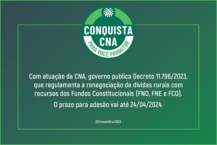 Brasília (29/11/2023) – Com atuação da Confederação da Agricultura e Pecuária do Brasil (CNA), o Governo Federal regulamentou a Lei nº 14.166/2021, que teve o prazo para as renegociações extraordinárias de dívidas rurais e não rurais com recursos dos Fundos Constitucionais de Financiamento do Centro-Oeste (FCO), do Norte (FNO) e do Nordeste (FNE) reaberto em abril por meio da Lei 14.554/2023.