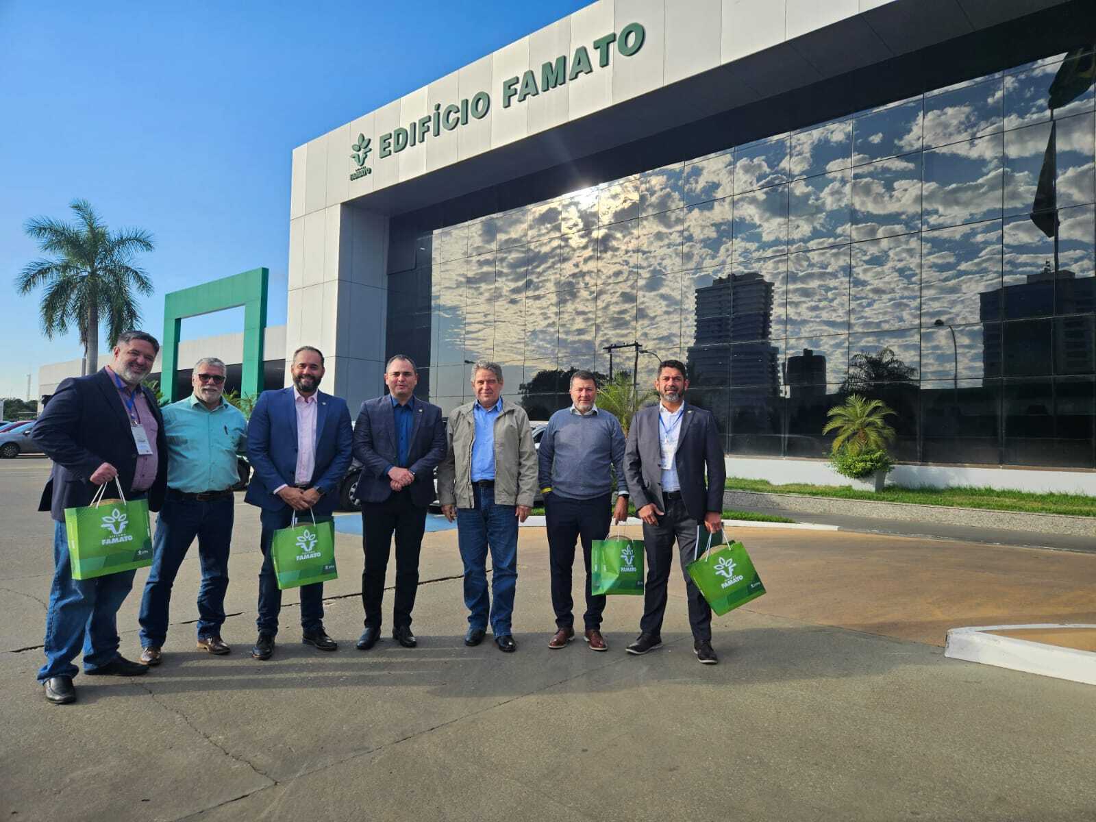 A comitiva foi recepcionada pelo presidente do Sistema Famato, Vilmondes Tomain e pelos diretores, Robson Marques (Administrativo e Financeiro) e Ronaldo Vinha (Relações Institucionais).