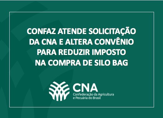Brasília (27/04/2020) – O Conselho Nacional de Política Fazendária (Confaz) atendeu a uma solitação da Confederação da Agricultura e Pecuária do Brasil (CNA) e alterou o Convênio ICMS nº 30/20, incluindo no grupo de equipamentos com redução de imposto o silo bag, também conhecido como silo bolsa, utilizado para o armazenamento de grãos e silagem.