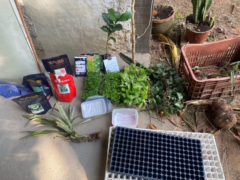 Durante a aula foram trabalhadas as noções conceituais para a produção de mudas de qualidade, montagem de substratos, semeio em bandejas, exemplos práticos de propagação vegetativa e transplante para canteiro definitivo de forma consorciada.