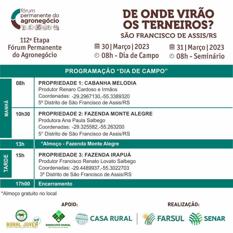 Quando: 12 de abril, às 8h (Dia de Campo); e 13 de abril às 8h (Seminário)