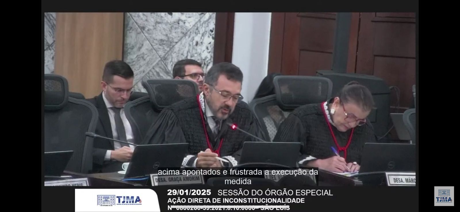 A sessão do Órgão Especial, realizada em 29 de janeiro de 2025, retomou o julgamento da Ação Direta de Inconstitucionalidade (ADI) proposta pela Ordem dos Advogados do Brasil – Seção Maranhão (OAB/MA). O Desembargador José Nilo Ribeiro Filho divergiu do voto da Relatora, Desembargadora Sônia Amaral, e do Desembargador Gervásio Protasio dos Santos, que havia pedido vistas. O voto divergente do Desembargador Nilo foi acompanhado por outros desembargadores, resultando na declaração de inconstitucionalidade da lei.