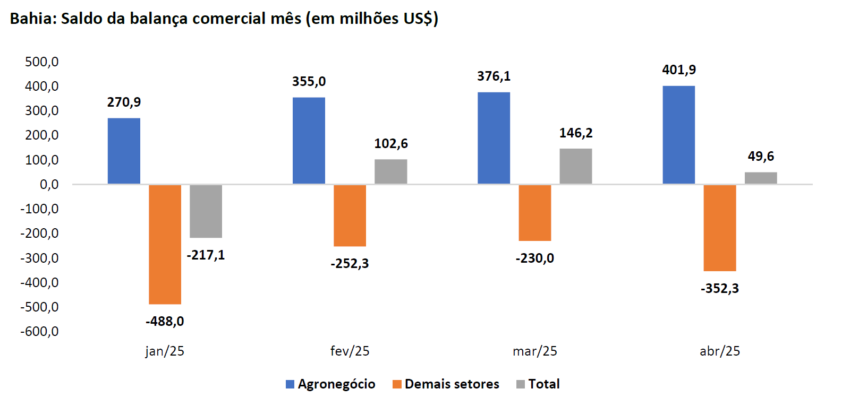 O resultado expressivo do agro foi decisivo para reverter o cenário comercial do estado: a Bahia saiu de um déficit (importações mais altas do que exportações) de US$ 87,7 milhões em abril de 2024 para um superávit (exportações mais altas do que importações) de US$ 49,6 milhões em abril de 2025. No total, o setor respondeu por 52% de tudo que foi exportado pelo estado no mês analisado.