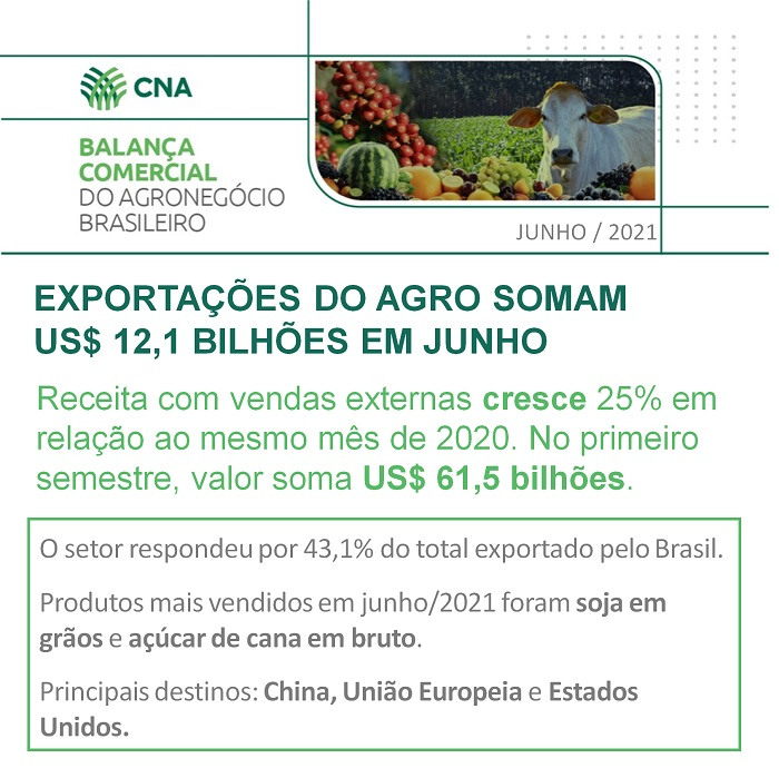 Brasília (19/07/2021) – As exportações do agro somaram US$ 12,1 bilhões em junho de 2021, alta de 25% na comparação em relação ao mesmo período de 2020, segundo análise feita Confederação da Agricultura e Pecuária do Brasil (CNA) com base nos dados do Ministério da Economia. O desempenho mensal foi favorecido pela manutenção do movimento de alta nos preços das commodities.