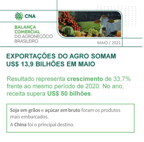 Brasília (17/06/2021) – As exportações do agro totalizaram US$ 13,9 bilhões em maio deste ano, crescimento de 33,7% em relação ao mesmo período de 2020, segundo análise da Confederação da Agricultura e Pecuária do Brasil (CNA) com base nos dados do Ministério da Economia. Foi o quarto mês consecutivo de aumento das vendas externas em 2021 na comparação com os mesmos meses do ano passado.