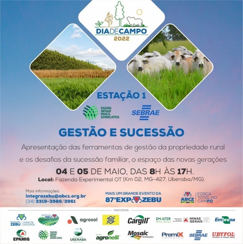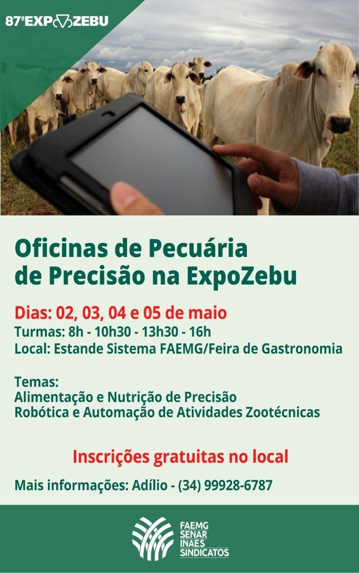 A programação inclui ainda oficinas de pecuária de precisão, com os temas Alimentação e Nutrição de Precisão e Robótica e Automação de Atividades Zootécnicas, e participação nos Dias de Campo, que vão ocorrer na Fazenda Experimental Orestes Prata Tibery Júnior, nos dias 4 e 5 de maio. Outras participações serão no Seminário de Defesa Agropecuária Integrada, promovido pelo Instituto Mineiro de Agropecuária (IMA), em parceria com o Sistema FAEMG, e no encontro ABCZ Jovem, com a palestra sobre “Inovação e Sucessão no Campo”, com a gerente de Formação Profissional Rural e Promoção Social, Liziana Rodrigues.