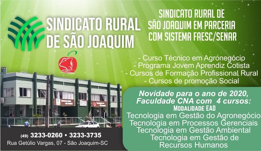 Para gerar oportunidade aos produtores rurais, a Faculdade de Tecnologia CNA abriu nesta semana o primeiro polo de ensino catarinense no município de São Joaquim, reconhecido como a capital nacional da maçã. As inscrições para o processo seletivo dos cursos de graduação em Gestão do Agronegócio, Processos Gerenciais, Gestão Ambiental e Gestão de Recursos Humanos estão abertas até 21 de fevereiro. Estão disponíveis 350 vagas por curso e o investimento mensal será de R$ 179,00.