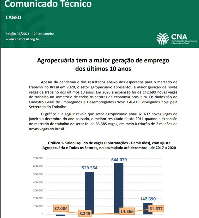 Brasília (03/02/2021) – O agro teve em 2020 o melhor resultado na geração de empregos no setor desde 2011, apesar da pandemia e dos resultados abaixo do esperado na criação de novos postos de trabalho.