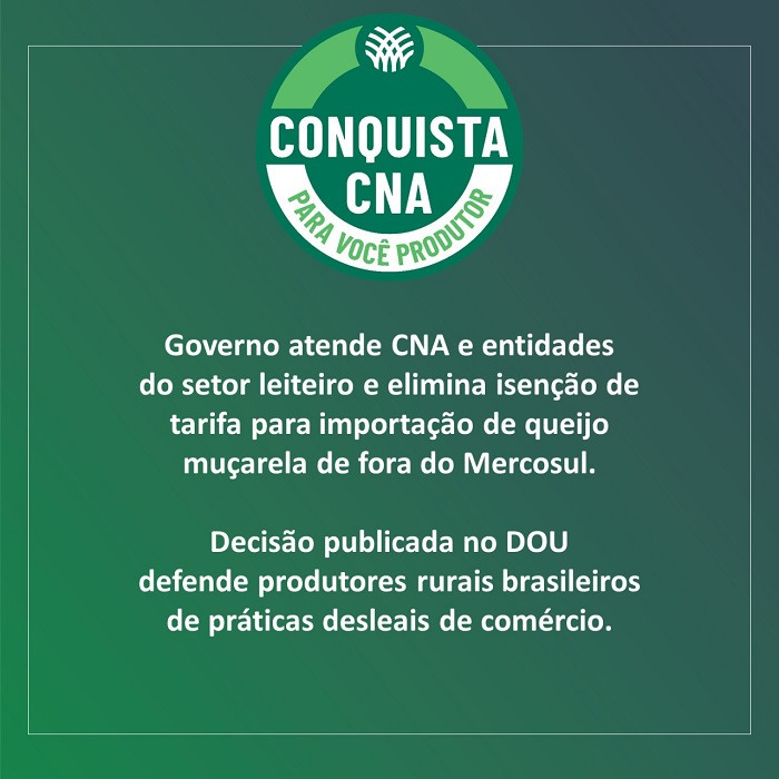 Brasília (12/05/2022) – O Governo Federal atendeu a Confederação da Agricultura e Pecuária do Brasil (CNA) e entidades do setor leiteiro, que somaram esforços para eliminar a isenção tarifária para importação de queijo muçarela de fora do Mercosul. Com a decisão publicada nesta quinta (12), no Diário Oficial da União (Resolução nº 341/2022 do Gecex), volta a valer a tarifa de 28% para o produto.