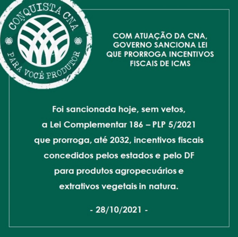 O presidente da República, Jair Bolsonaro, aprovou sem vetos o texto, que foi publicado no Diário Oficial da União (DOU) desta quinta (28), atendendo a um pedido da CNA. A lei prorroga até 2032 as isenções, os incentivos e benefícios fiscais concedidos pelos estados e o Distrito Federal para manutenção ou incremento das atividades comerciais e agropecuárias.