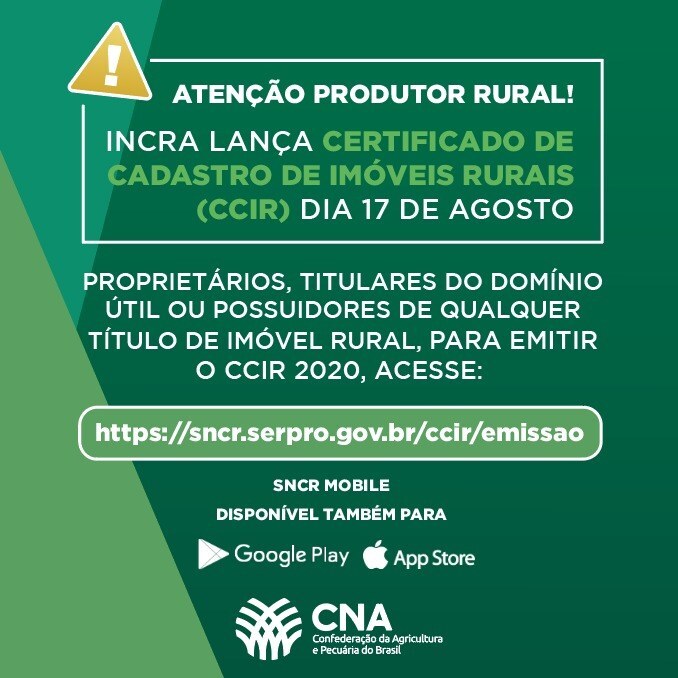 Os proprietários, titulares do domínio útil ou possuidores a qualquer título de imóvel rural poderão acessar o Sistema Nacional de Cadastro Rural para emissão do CCIR. O processo também poderá ser feito por meio de dispositivos móveis com o aplicativo SNCR-Mobile, disponível nas plataformas Google Play ou App Store.