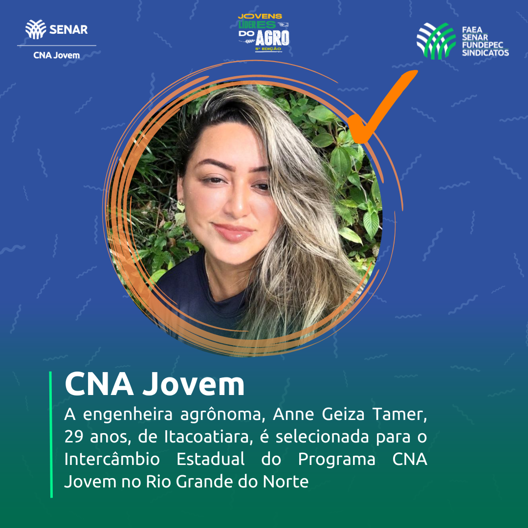 A engenheira agrônoma, Anne Geiza Tamer, de 29 anos, de Itacoatiara, será a representante do Amazonas no Intercâmbio Estadual promovido pelo Programa CNA Jovem. Ela está entre os seis selecionados em todo o Brasil pela coordenação nacional do programa e vai estar entre os dias 26 e 27 de agosto participando do encontro da etapa estadual no Rio Grande do Norte.