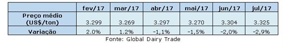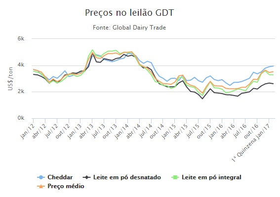 Os preços futuros indicam que ao longo do primeiro semestre de 2017, o mercado de leite em pó integral tende a permanecer estável, com valores ao redor de US$3.300/tonelada.