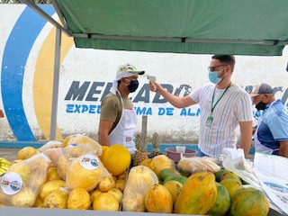 A aferição de temperatura corporal tem sido uma medida de segurança durante a pandemia da covid-19. Nos treinamentos do Senar Bahia o ato é orientado como fundamental para proteção da saúde de todos, feirantes e clientes.