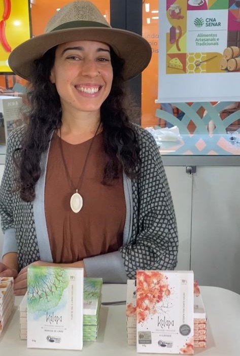 O chocolate harmonizado com o café é da marca Kalapa, de Belo Horizonte, e ficou em 2º lugar no Prêmio CNA Brasil Artesanal 2021. Para a produtora Luiza Dantas Santiago, expor e comercializar no estande é uma oportunidade de mostrar ao público a história do produto e como ele é feito.