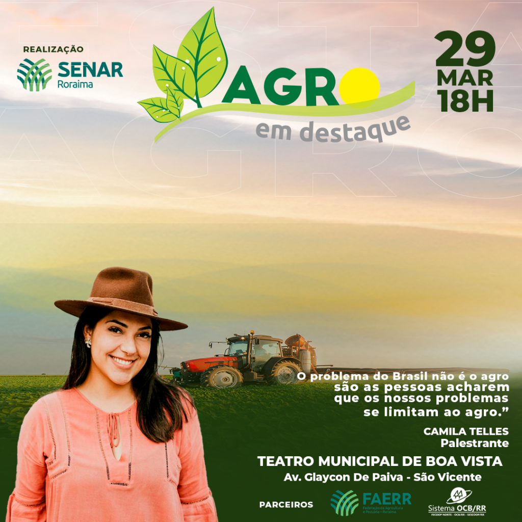 O Serviço Nacional de Aprendizagem Rural – Senar Roraima - realizará, no próximo dia 29 de março, o evento “O Agro em Destaque”, no qual promoverá, gratuitamente, a palestra “Agro: o que muitos vivem e poucos conhecem”, com a digital influencer Camila Telles. O evento acontecerá no teatro Municipal de Boa Vista, com início às 18h.