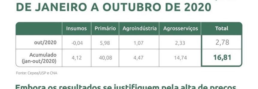 Com este resultado no ano, aumentam as perspectivas de um resultado recorde para 2020. “O PIB do agronegócio cresceu lentamente em abril e em maio, devido aos impactos negativos da pandemia sobre diferentes atividades do setor. Mas, com a forte aceleração verificada desde junho, a perspectiva de um crescimento recorde anual em 2020 vai se concretizando”, destaca o Comunicado Técnico.