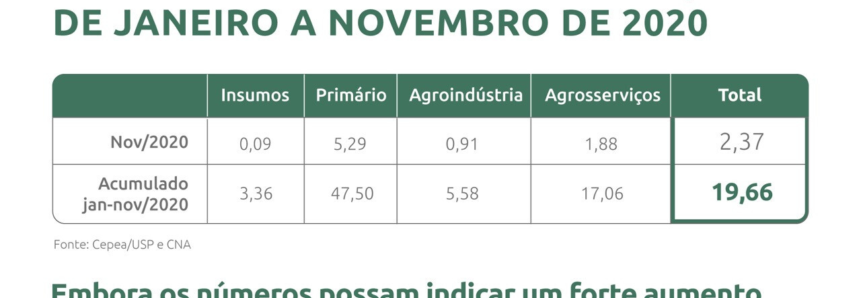Todos os segmentos da cadeia produtiva do agronegócio brasileiro no geral tiveram alta em 2020, com destaque para o setor primário (56,59%), seguido por agrosserviços (20,93%), agroindústria (8,72%) e insumos (6,72%). O desempenho do PIB do agronegócio reflete a evolução da renda real do setor, em que são consideradas as variações tanto de volume quanto de preços reais.