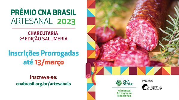 Brasília (07/03/2023) – As inscrições para o II Prêmio Brasil Artesanal 2023 – Charcutaria foram prorrogadas até o dia 13 de março. O concurso é promovido pela Confederação da Agricultura e Pecuária do Brasil (CNA) com o objetivo de reconhecer os produtores dos melhores salames (tipo italiano) artesanais do Brasil.