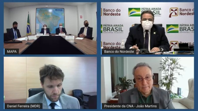 A cerimônia virtual contou com a presença da ministra da Agricultura, Tereza Cristina, do presidente do Banco do Nordeste (BNB), Romildo Rolim, e do secretário-executivo adjunto do Ministério do Desenvolvimento Regional (MDR), Daniel Ferreira, além de representantes dos dois órgãos.
