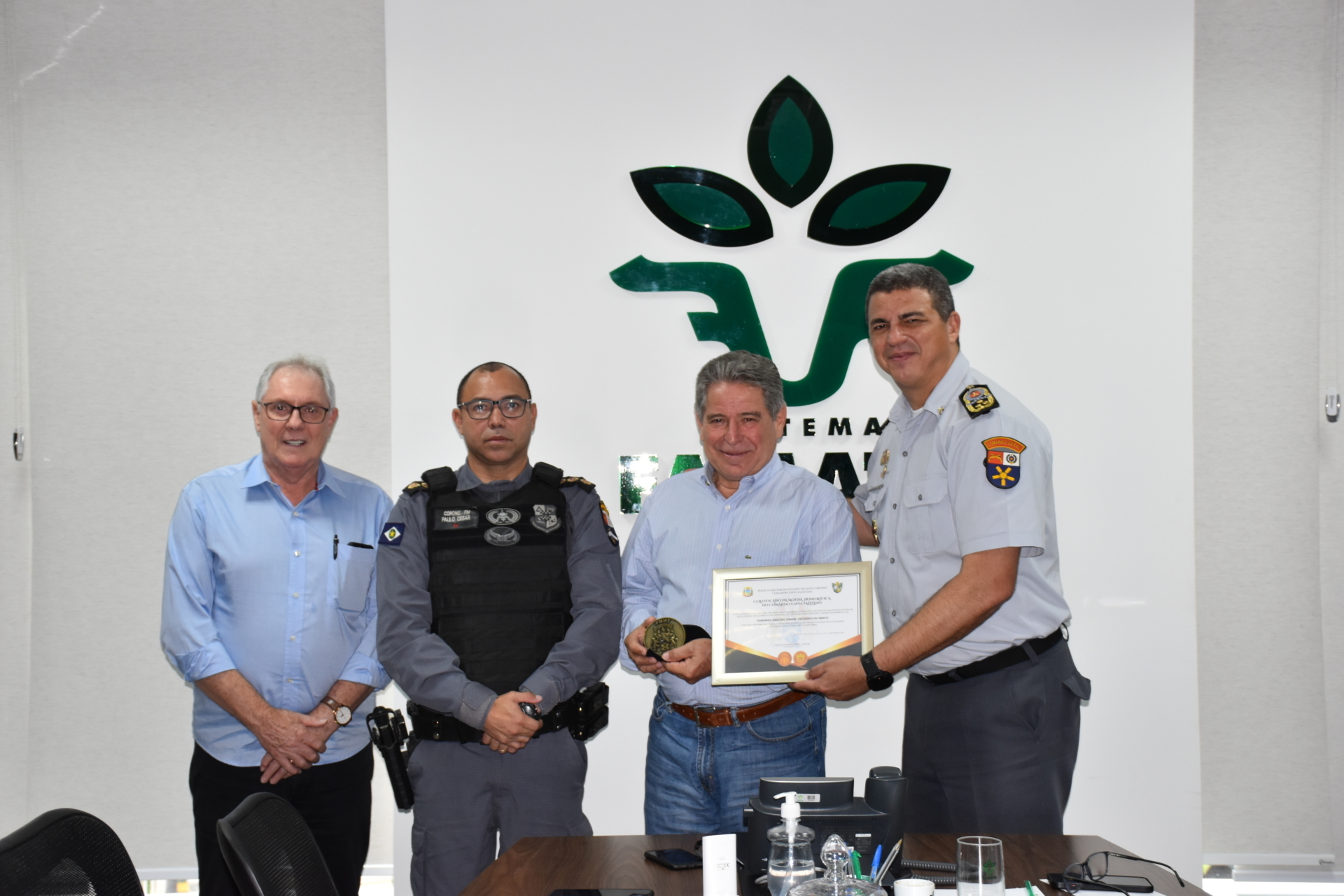 E como forma de reconhecimento a integração e apoio às unidades especializadas, bem como apoio no projeto de Patrulhamento Rural da PMMT, o comandante Geral, coronel Alexandre Corrêa Mendes fez a entrega da honraria ao presidente Vilmondes Tomain.