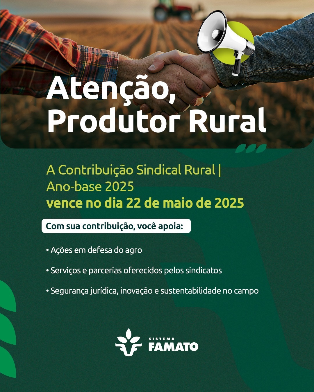 A Federação da Agricultura e Pecuária de Mato Grosso (Famato) alerta os produtores rurais de todo o estado para o prazo final de pagamento da Contribuição Sindical Rural, ano-base 2025. O vencimento, tanto para pessoas físicas quanto jurídicas, é 22 de maio de 2025 (quinta-feira). O boleto é enviado pelos Correios pela Confederação da Agricultura e Pecuária do Brasil (CNA) e pode ser pago em qualquer instituição bancária.