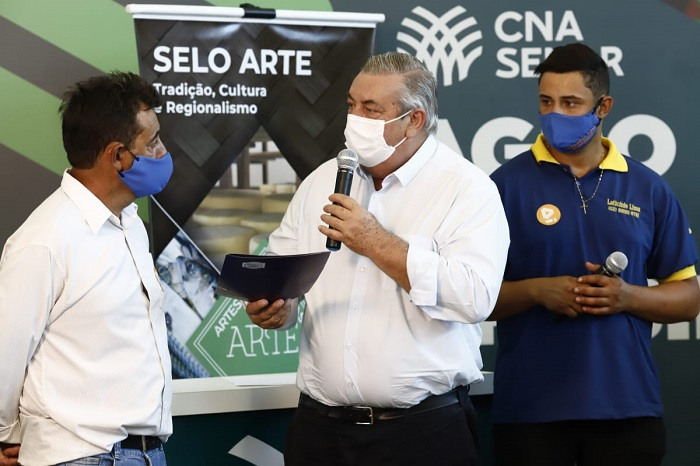 Brasília (03/10/2020) – Três produtores de queijos artesanais de Goiás receberam o Selo Arte, no sábado (03), durante a segunda edição do projeto Agro pelo Brasil. A entrega dos certificados foi feita pela ministra da Agricultura Tereza Cristina; pelo governador de Goiás, Ronaldo Caiado; e pelo presidente da Federação da Agricultura e Pecuária do Estado de Goiás (FAEG), dep. José Mário Schreiner, na sede do Sindicato Rural de Alexânia.