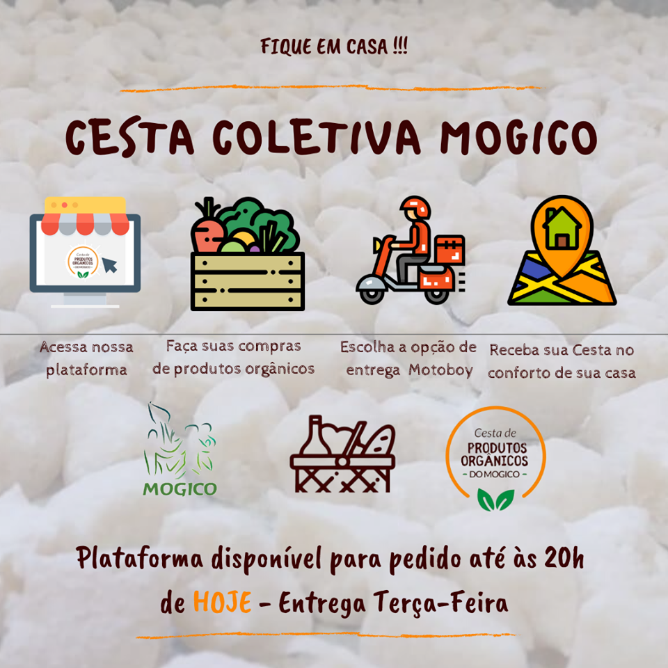 Além da Cesta Coletiva (https://cestamogico.lojaintegrada.com.br/), o coletivo Mogico continua realizando a Feira Orgânica Mogico aos sábados, de 8 às 12h, na praça do bairro Bom Pastor.