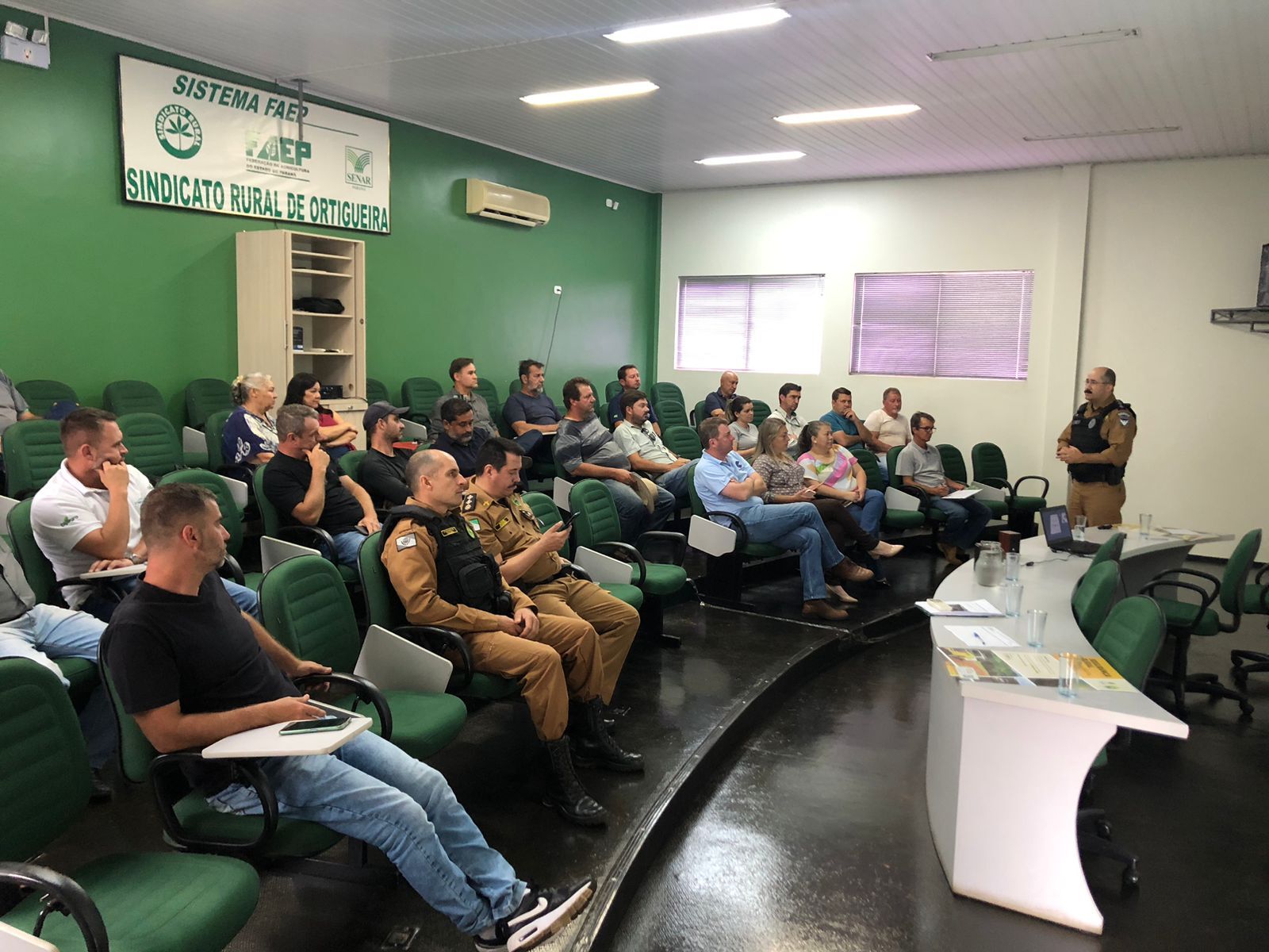Os produtores rurais de Ortigueira, no Centro Oriental paranaense, receberam mais um incentivo para se engajar no combate à criminalidade no campo. Nesta terça-feira (29), o subcomandante e militares estaduais da Patrulha Rural Comunitária do 26° Batalhão de Polícia Militar (BPM) do Paraná apresentaram no sindicato rural local o Programa Patrulha Rural Comunitária 4.0, desenvolvido pela Polícia Militar do Paraná (PMPR). A iniciativa visa proporcionar mais segurança e reduzir os índices de criminalidade no campo.
