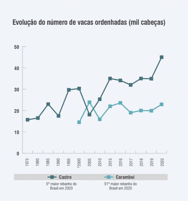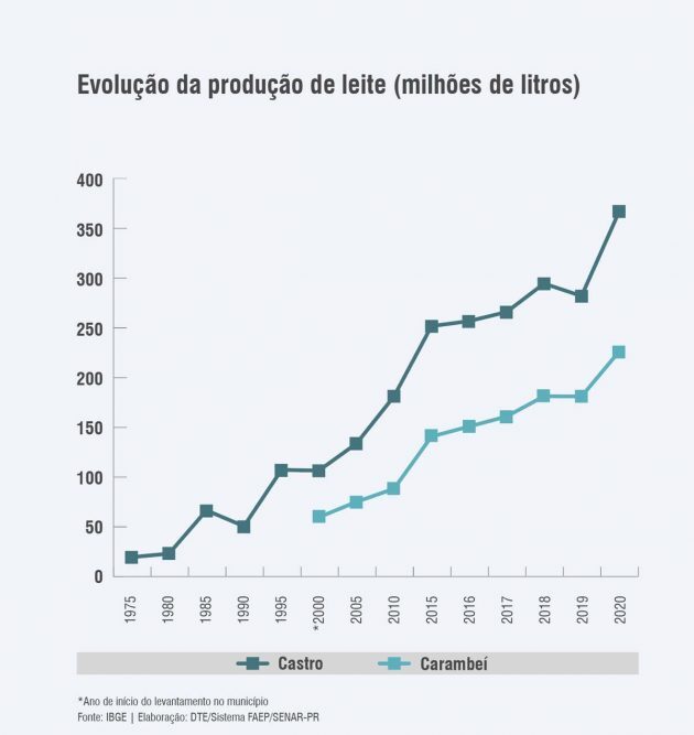 Apesar dos números totais impressionarem, não é só em volume que os negócios têm se intensificado, mas também em evolução de produtividade. Para se ter ideia, de acordo com dados do Instituto Brasileiro de Geografia e Estatística (IBGE), Castro teve um aumento de 550% na produtividade em 45 anos. Considerando 2020, se apenas o leite de Castro fosse um município, o Valor Bruto de Produção (VBP) Agropecuário seria maior que de outros 358 municípios paranaenses dos 399 que existem no Estado. Já em Carambeí, a cidade tem apenas o 51º maior rebanho nacional e, ainda assim, é o segundo maior produtor do Brasil. Nessa mesma localidade, o volume total de leite mais do que dobrou nos últimos 10 anos.