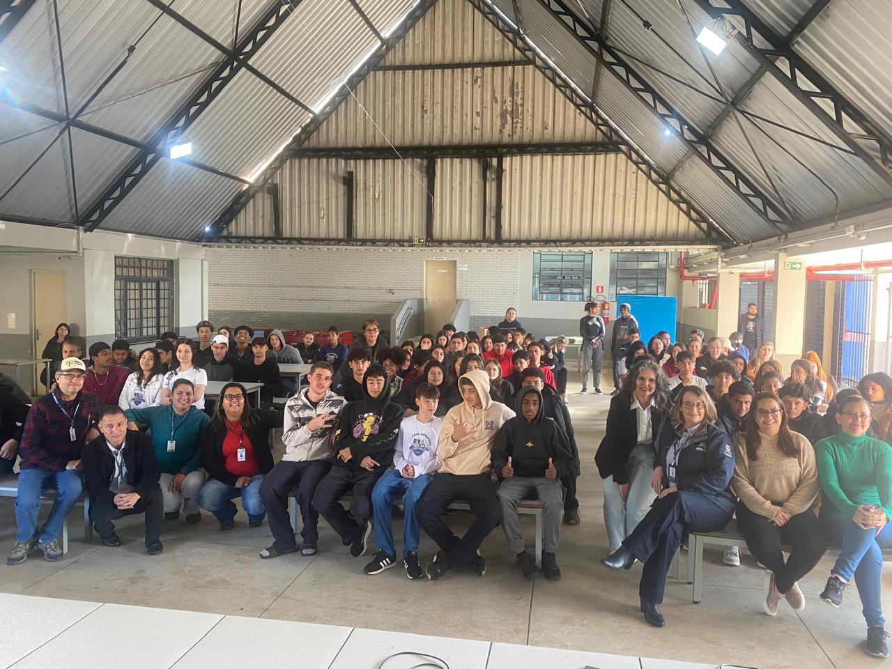 Professora Leine Carvalho Volpe e alunos do 9º ano do Colégio Estatual Barão do Cerro Azul, que participaram do projeto