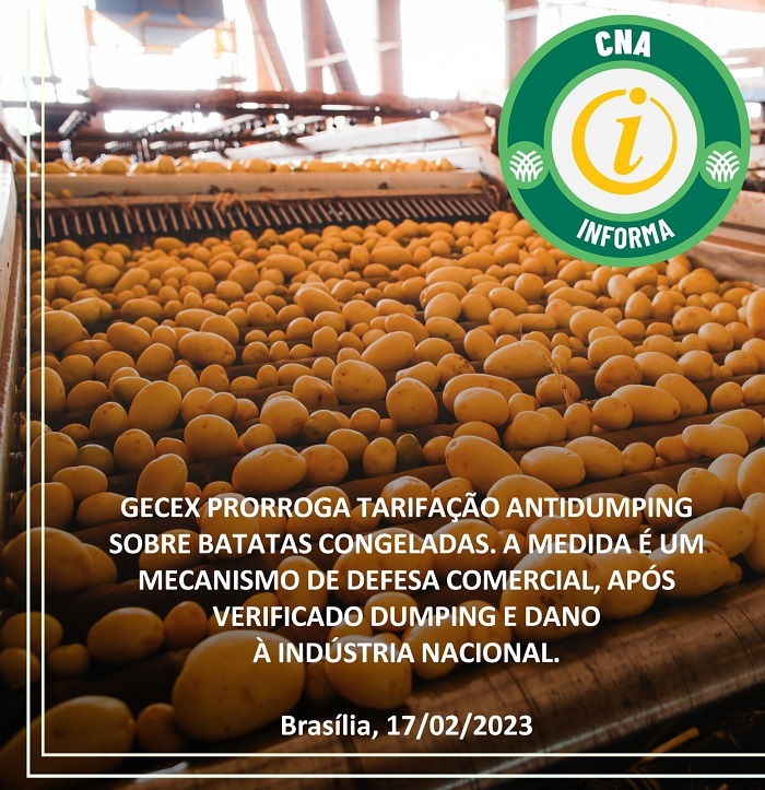 Brasília (17/02/2022) – A Confederação da Agricultura e Pecuária do Brasil (CNA) avaliou que a prorrogação do direito antidumping por cinco anos para a batata congelada importada vai impedir prejuízos e fomentar a produção nacional, reduzindo danos com práticas desleais no comércio internacional do produto.