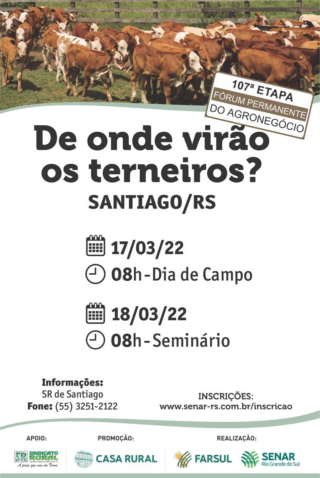 Nesse cenário, chega a primeira edição de 2022 do Fórum “De onde Virão os Terneiros”. O evento será realizado nos dias 17 e 18 de março, em Santiago, na região Centro do Estado.