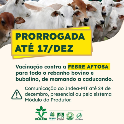Os pecuaristas de Mato Grosso terão mais tempo para vacinar os rebanhos bovino e bubalino, de mamando a caducando contra a febre aftosa. A segunda etapa da campanha de vacinação de 2022, que encerraria dia 30 de novembro, foi prorrogada até o dia 17 de dezembro, inclusive para os pecuaristas do Pantanal. A determinação foi divulgada pelo Ministério da Agricultura, Pecuária e Abastecimento (Mapa) na última sexta-feira (25/11).