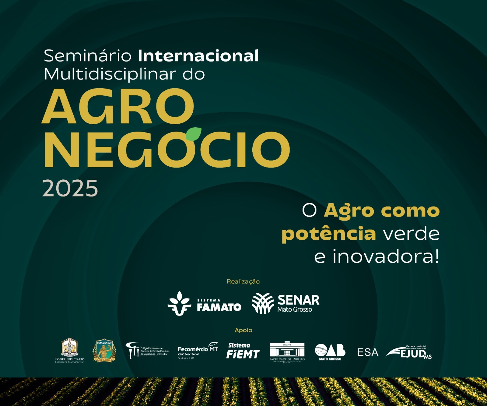 Nos dias 22 e 23 de maio de 2025, o Seminário Internacional Multidisciplinar do Agronegócio acontecerá no Cenarium Rural, em Cuiabá. Promovido pela Federação da Agricultura e Pecuária de Mato Grosso (Famato) e pelo Serviço Nacional de Aprendizagem Rural de Mato Grosso (Senar-MT), o evento terá sua abertura oficial no dia 22/05 (quinta-feira), às 18h. O seminário reunirá produtores rurais, magistrados e especialistas nacionais e internacionais para discutir os principais desafios e oportunidades do agronegócio brasileiro, com foco em segurança jurídica, economia e sustentabilidade ambiental. No dia 23/05 (sexta-feira), a programação terá início às 8h e contará com oito painéis temáticos ao longo do dia.