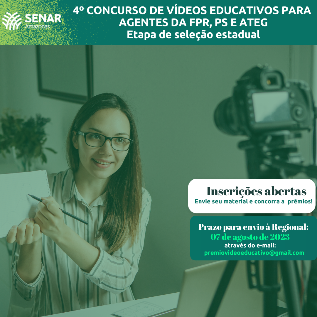 O Senar Amazonas está com inscrições abertas até 07 de agosto para a etapa estadual da 4ª edição do Concurso de Vídeos Educativos para instrutores da Formação Profissional Rural (FPR), Promoção Social (PS) e técnicos de campo da Assistência Técnica e Gerencial (ATeG) do Senar. O concurso, é destinado a profissionais devidamente credenciados nas Administrações Regionais com o objetivo de destacar a importância do trabalho dos instrutores e técnicos de campo engajados na produção de vídeos para disseminação do conhecimento ao público rural.