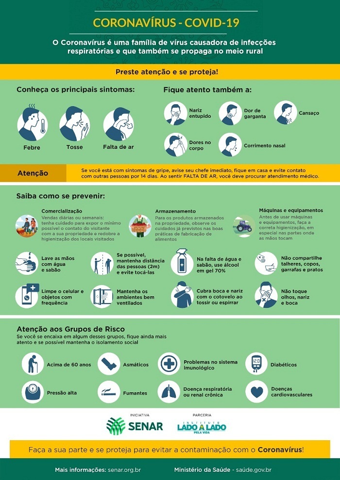 Cartilhas – As recomendações de prevenção ao coronavírus estão ilustradas em cartilhas e cartazes com detalhes sobre as formas de prevenção à doença, sintomas e medidas sanitárias, como evitar o uso compartilhado de ferramentas e equipamentos e a limitação de acesso às propriedades rurais apenas por pessoas estritamente necessárias.