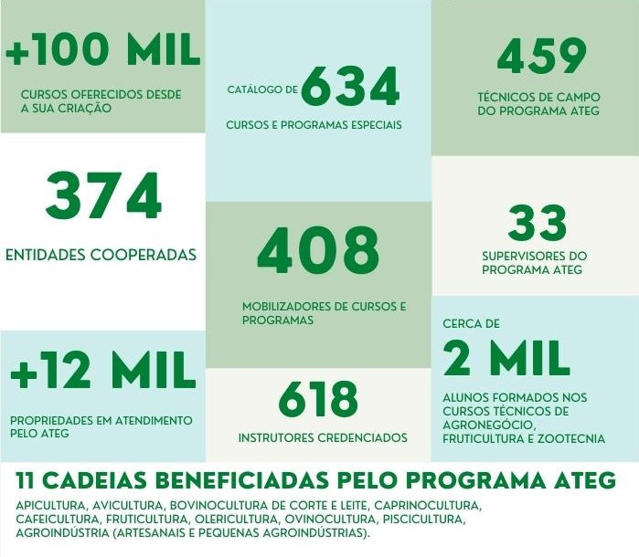 Neste 7 de abril, o agro mineiro comemora mais um aniversário do SENAR MINAS (Serviço Nacional de Aprendizagem Rural). São 29 anos levando cursos e programas para produtores e trabalhadores rurais e seus familiares. Mais de um milhão de pessoas já participaram dos treinamentos de Formação Profissional Rural e Promoção Social e de projetos como o Programa de Assistência Técnica e Gerencial (ATeG). Mais de 12 mil propriedades rurais atendidas só neste ano, por meio de 459 técnicos de campo e 33 supervisores. Outro destaque é o Centro de Excelência em Cafeicultura, que está sendo construído em Varginha e, em 2023, deverá capacitar até 300 alunos, simultaneamente.