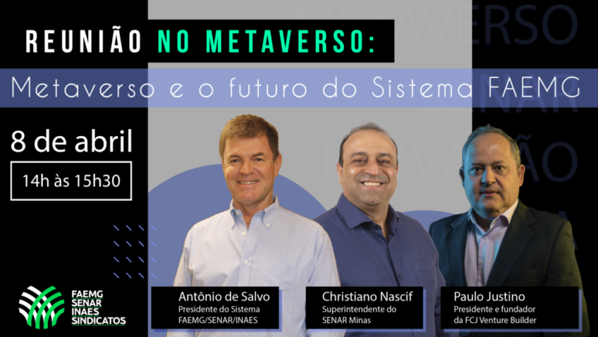 O evento será realizado em espaço 100% virtual, com convidados reais que poderão interagir de forma imersiva entre si. O encontro “Metaverso e o futuro do Sistema FAEMG” terá a participação do presidente do Sistema FAEMG, Antônio de Salvo; do superintendente do SENAR MINAS, Christiano Nascif; e do presidente e fundador da FCJ Venture Builder, Paulo Justino.