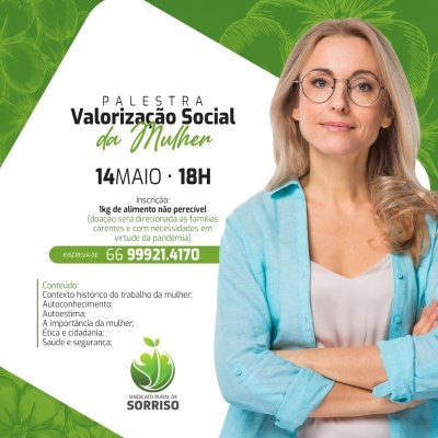 Com o objetivo de promover conhecimento e acolhimento às mulheres, o Sindicato Rural de Sorriso em parceria com o Serviço Nacional de Aprendizagem Rural de Mato Grosso (Senar-MT) realiza na próxima sexta-feira (14) uma palestra com o tema "Valorização Social da mulher". O evento ocorrerá na sede do Sindicato Rural de Sorriso e contará com arrecadação de alimentos não perecíveis.