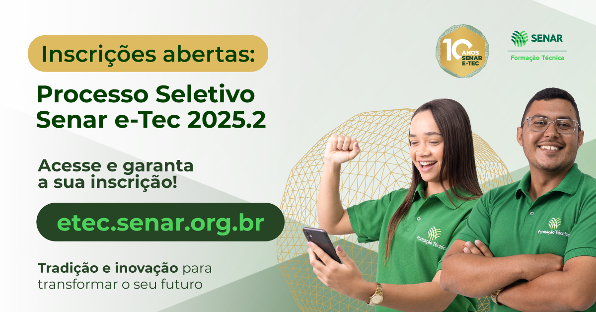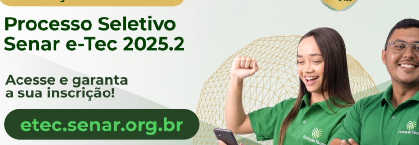 O Serviço Nacional de Aprendizagem Rural de Pernambuco (Senar-PE) abriu nesta terça-feira (13) as inscrições para o processo seletivo do curso técnico gratuito, de nível médio em Agricultura, no Polo Machados. Os interessados devem se inscrever por meio do portal www.senar.org.br/etec onde também está disponível o edital da seleção.