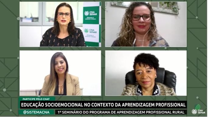 Participaram do debate a Educadora especializada em Psicopedagogia e autora de materiais pedagógicos sobre Educação Socioemocional, Karen Kroll; a gerente pedagógica do Senar Minas e especialista em educação positiva, habilidades para o futuro e inovação, Cristiane Trigueiro; e a instrutora do Senar Minas Solange Regina Pinto Palmeira.